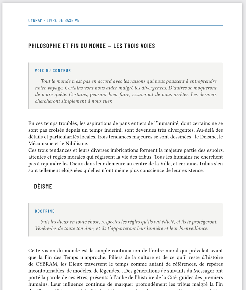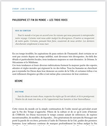 Le monde a des secrets. Ce que les personnages savent du monde n'est pas ce que le monde est vraiment. CYBRAM est conçu pour être découvert par couches, au fil des sessions, à mesure que les révélations du MJ transforment rétrospectivement ce que les joueurs croyaient comprendre. C’est pourquoi le jeu est plus adapté au format « campagne » qu’à de simples sessions courtes.
