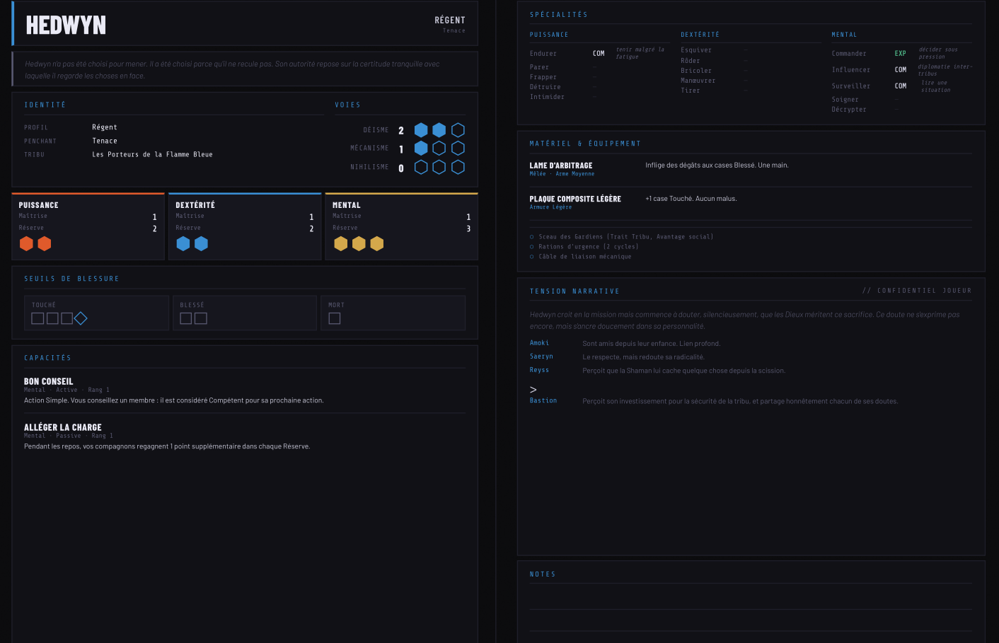 La tribu est un personnage à part entière. Avant de créer vos personnages, vous créez ensemble votre tribu : son nom, ses ressources, sa philosophie, sa réputation. Les hauts faits que vous accomplirez deviendront des Légendes inscrites sur sa fiche. Les catastrophes laisseront des Traumatismes. La tribu grandit, souffre et évolue au même titre que les individus qui la composent.